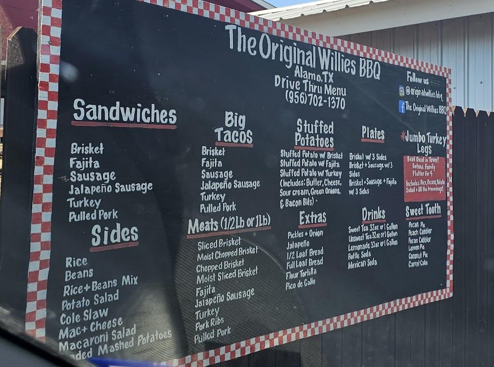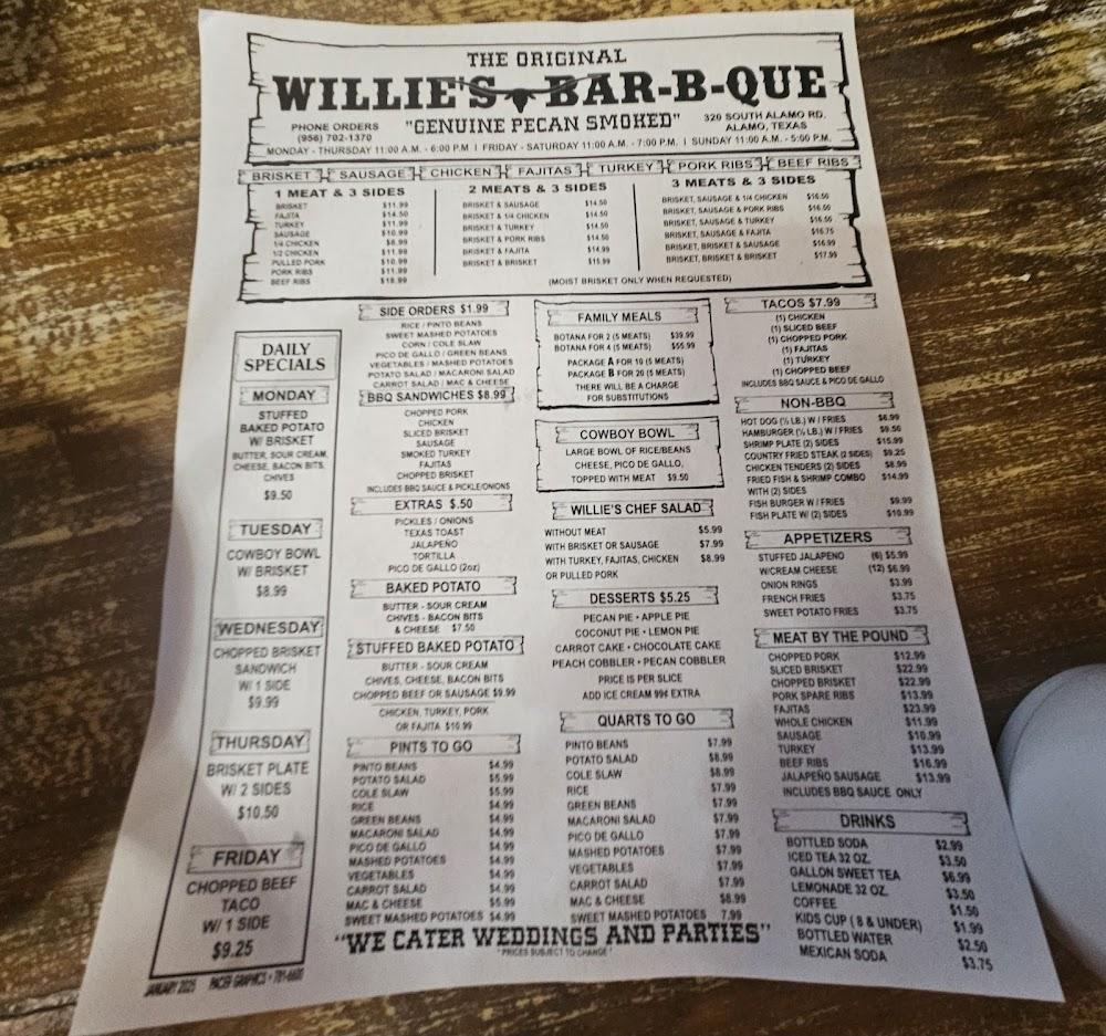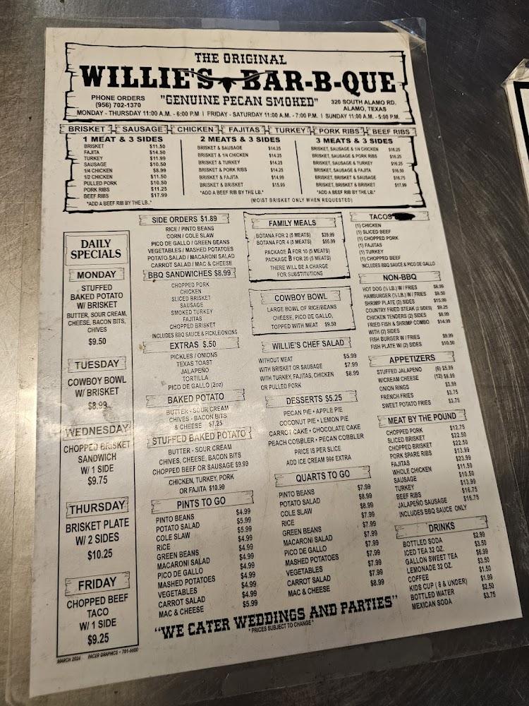 Welcome to The Original Willie's Bar-B-Q, your go-to destination for mouthwatering barbecue in Alamo, TX. Located at 320 S Alamo Rd, we proudly serve a diverse menu featuring local specialties, delicious desserts, and an impressive selection of teas. Whether you're dining in, grabbing takeout, or enjoying our drive-thru service, our friendly staff is here to ensure you have a great experience. With an inviting atmosphere and accessible facilities, we cater to everyone, including families and groups. Come soak in our relaxed vibe for lunch or dinner and indulge in some of the finest barbecue around, all at an affordable price!